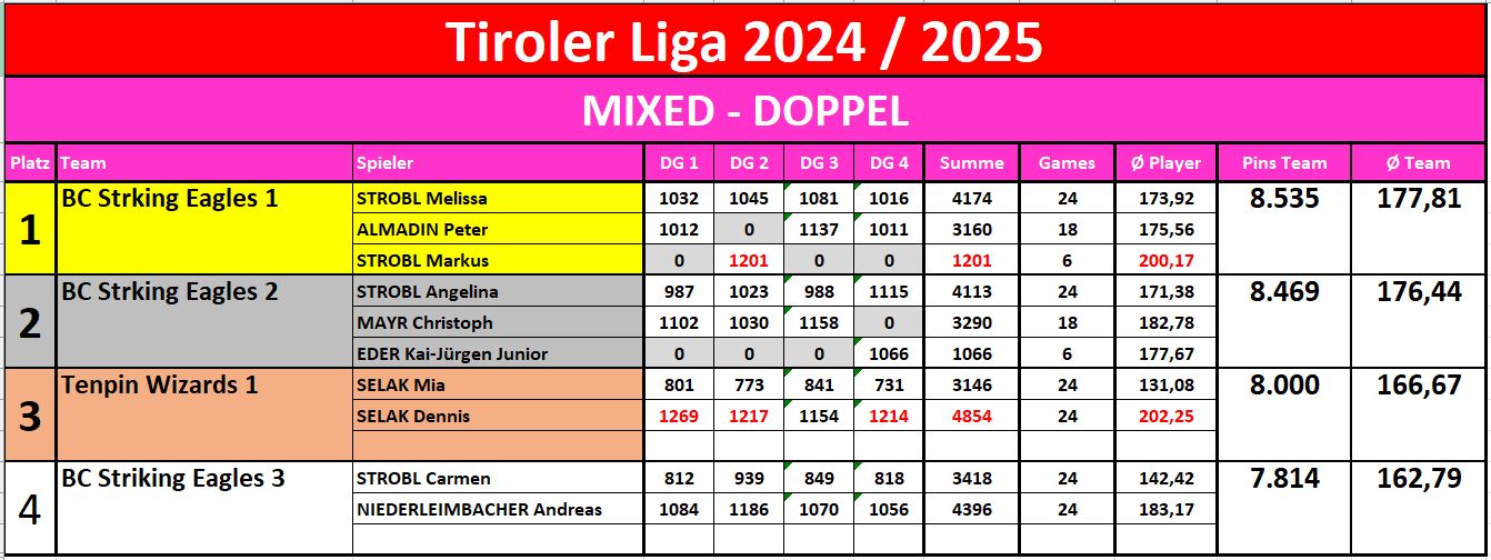 Tiroler Liga MIXED-DOPPEL 2024/25 Vorheriger Beitrag: Qualifikation STM Doppel 2024 Zurück Nächster Beitrag: Vereinswertung 2024 - 2025 Weiter